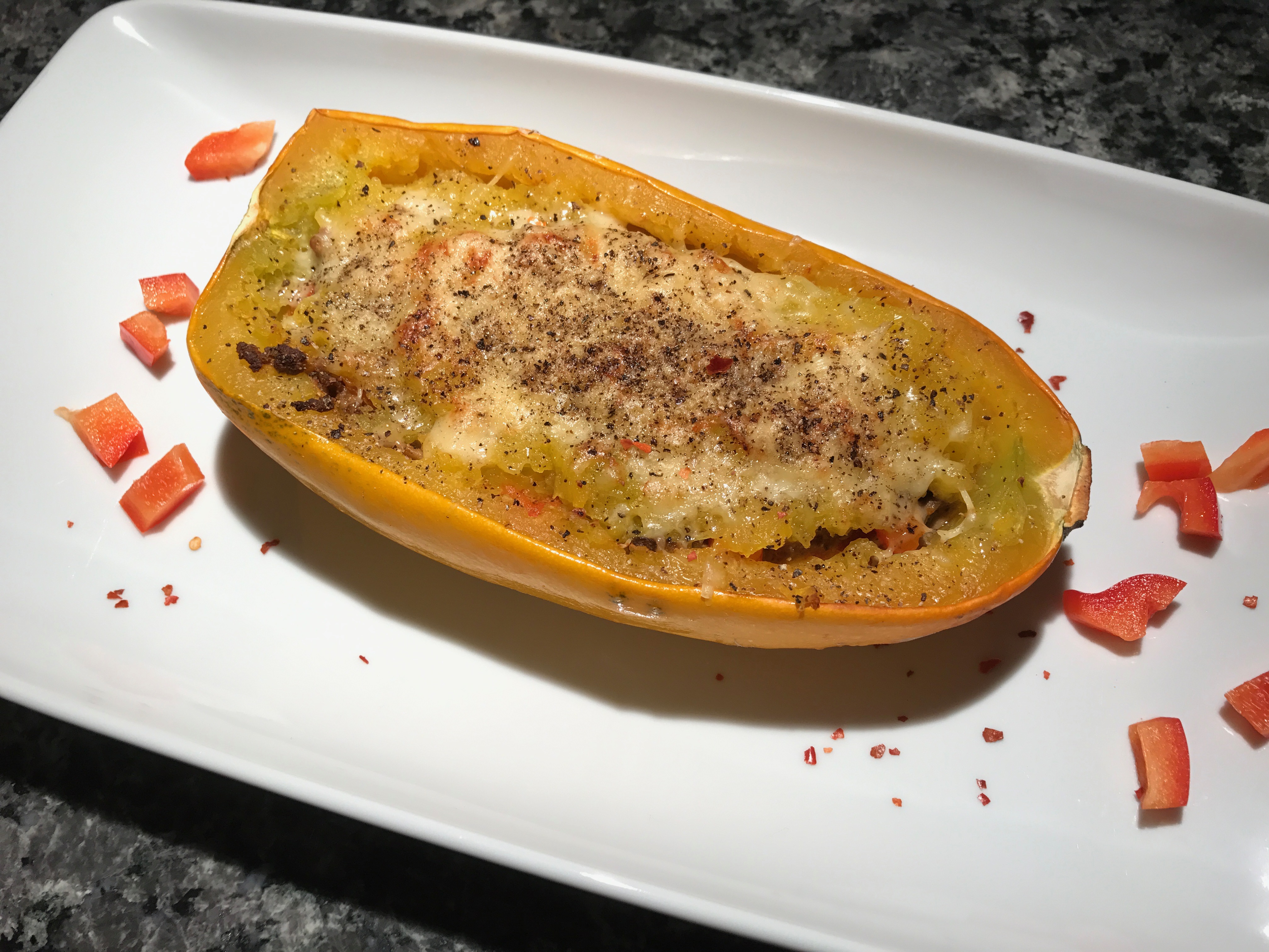 Den Spaghettikürbis in der Hälfte durchschneiden und die Kerne auslöffeln. Die Kürbishälften mit etwas Olivenöl beträufeln, leicht salzen und pfeffern und mit der geschnittenen Seite nach unten auf ein Backblech legen. Etwas Wasser auf das Backblech geben und die Kürbishälften für 45 Minuten bei 180 Grad in den Ofen geben.